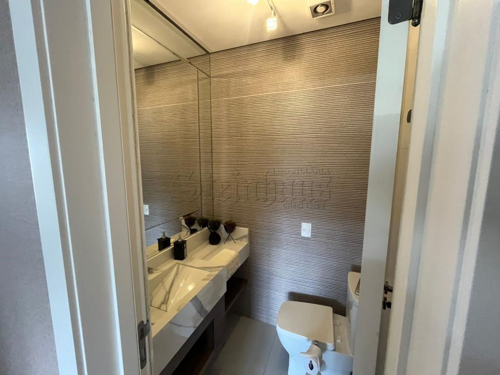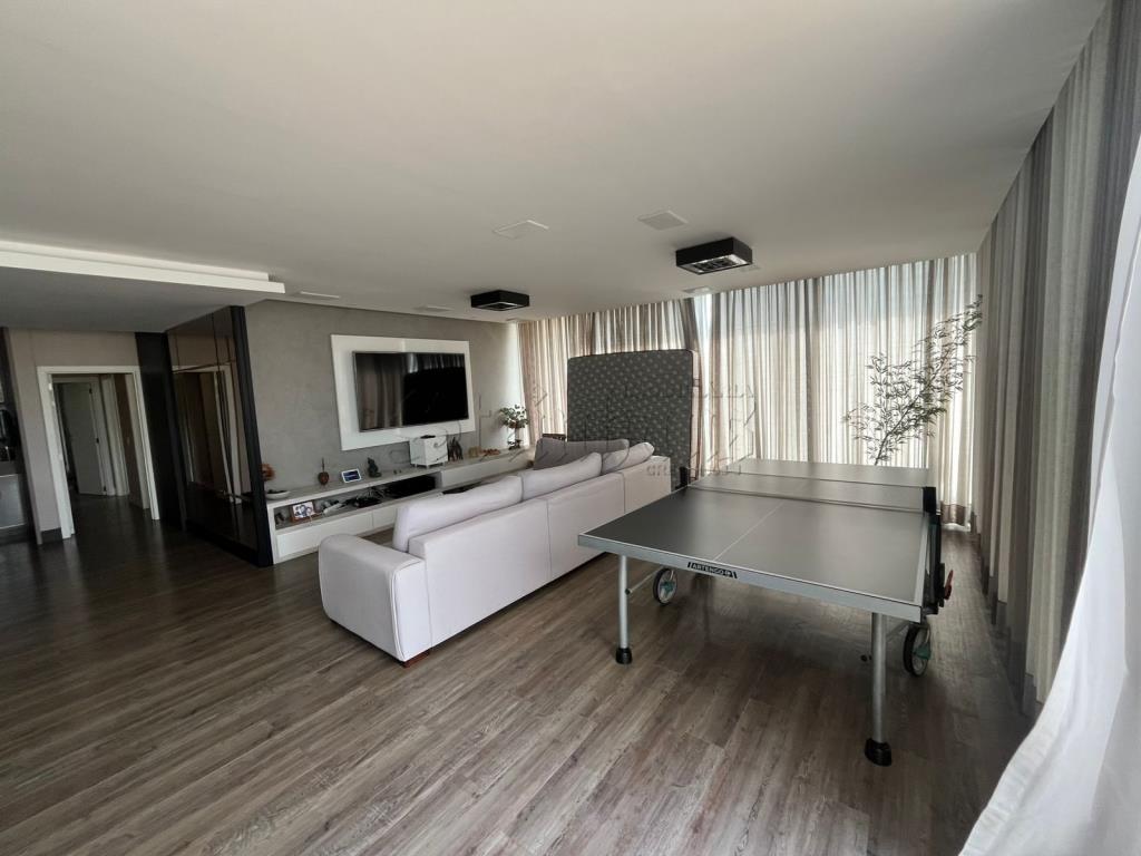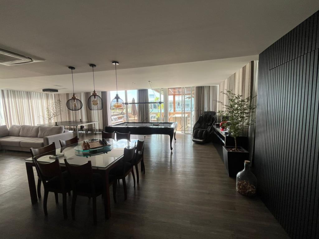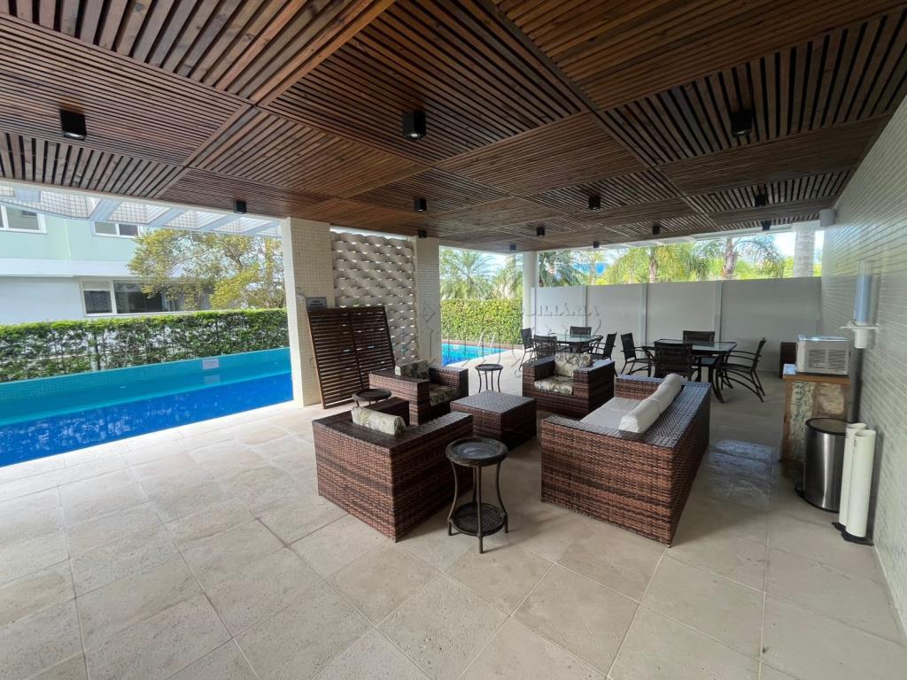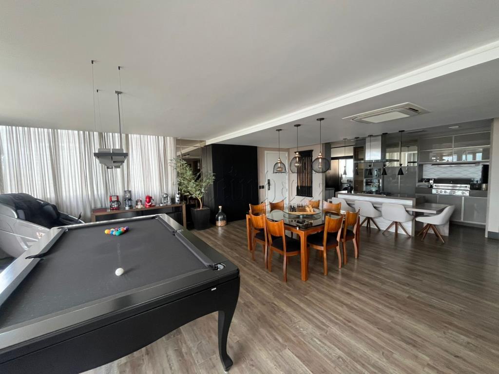 Com 3 suítes, 2 cozinhas, sala, sala com mesas de jogos, 2 vagas de garagem, lavabo, jacuzzi, área de serviço, churrasqueira.